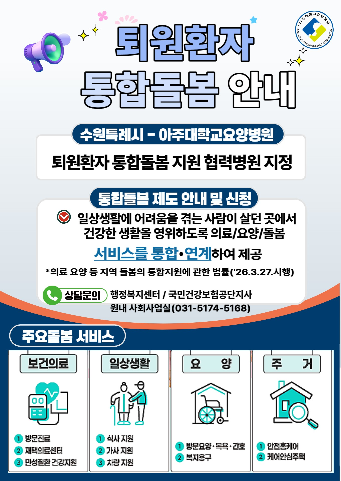 아주대학교요양병원은 회복기 재활치료와 암 재활이 필요한 환자를 중심으로 아주대학교병원과 지역사회를 연계한 다양한 치유·회복 프로그램을 운영하여 특성화된 요양의료서비스를 제공함으로서 지역사회와 환자 회복을 위한 재활의료 전달체계를 구축하고자 합니다. 아주대학교요양병원은 2030년까지 대한민국 회복기재활과 암재활의 거점 의료기관으로 성장하고, 지역사회 연계를 통한 통합의료시스템을 구축하겠습니다.